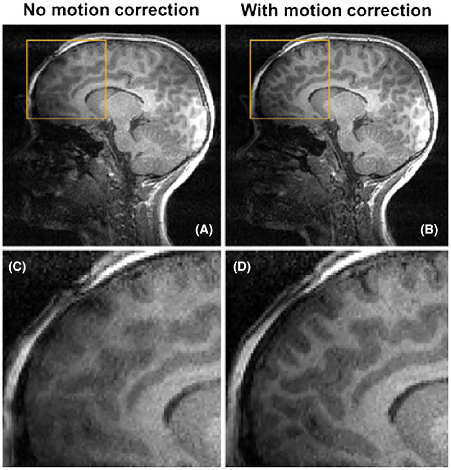 The following image was taken from the abstract: Retrospective correction of head motion using measurements from an electromagnetic tracker. It shows substantialy lower artifact levels in image B where retrospective motion correction was used vs image A which is the uncorrected image. Images C and D are zoomed in areas of A and B respectively. Image D shows reduced blurring and improved gray/white matter differentiation.